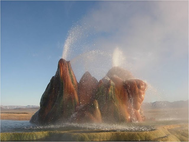 Fly Geyser is a very little known tourist attraction, even to Nevada residents. It is located right near the edge of Fly Reservoir and is only about 5 feet (1.5 m) high, (12 feet (3.7 m) if you count the mound on which it sits). The Geyser is not an entirely natural phenomenon, and was accidentally created in 1916 during the drilling of a well. The well functioned normally for several decades, but then in the 1960s geothermally heated water found a weak spot in the wall and began escaping to the surface. Dissolved minerals started rising and piling up, creating the mount on which the geyser sits, which is still growing to date. Today, water is constantly squirting out reaching 5 feet (1.5 m) in the air. The geyser contains several terraces discharging water into 30 to 40 pools over an area of 30 hectares (74 acres). The geyser is made up of a series of different minerals, including sulfur dioxide, which gives it its magnificent coloration.
